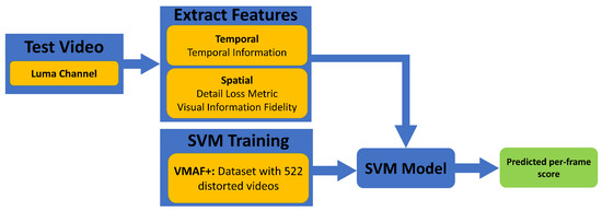 To compute VMAF, spatial and temporal video quality measures are initially extracted as feature maps [12,31]. Spatial metrics are derived from the Detail Loss Metric (DLM) and Visual Information Fidelity (VIF), while the temporal metric employs Temporal Information (TI). Detail losses, representing the absence of crucial visual data impacting content clarity, are evaluated across four scales using DLM. In contrast, VIF discerns these losses and visual information fidelity across four distinct scales. TI gauges the luminance difference between frame pairs to identify temporal variations resulting from movement, encapsulated by six unique features [31]. Following this, the average value of each feature is ascertained and channeled into a pre-trained SVM, which then predicts the per-frame quality score, with 0 denoting low quality and 100 signifying the highest quality [32]. The VMAF underlying model was developed using SVM regression on the VMAF+ video database. VMAF+ is a comprehensive Video Quality Assessment (VQA) dataset, comprising 522 videos subjected to diverse scaling and compression levels [33]. During the supervised learning phase, the VMAF model ascertains optimal weights for rudimentary metrics, learning from established ground truth scores [32]. These steps are portrayed in Figure 4. Consistent with other advanced video quality metrics, VMAF predominantly assesses the luma components of the video channel [33].