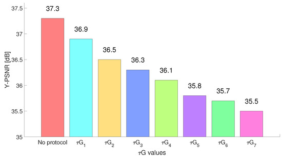 The PSNR, a standard measure of video quality, characterizes the relationship between a signal maximal energy and its associated noise, presented in decibels (dB) [25,28]. Although both luma and chrominance components of a frame can be evaluated by PSNR, the emphasis is predominantly placed on the luma channel. The initial step in determining PSNR involves calculating the Mean Squared Error (), expressed in Equation (1) [29]: