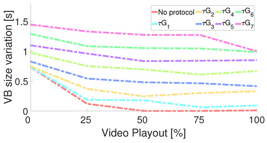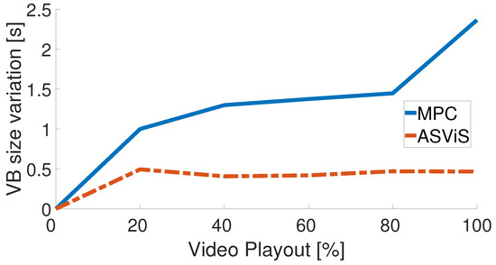 As illustrated in Figure 13, the relationship between the VB size variation and video playout was mapped. Results indicated that a mean VB size of 1.5 s with a standard deviation of 0.5 s was achieved by MPC, whereas ASViS achieved a mean of 0.45 s with a deviation of 0.08 s. Notably, greater stability after 20% of video playout was observed with ASViS, despite its reduced mean VB size.