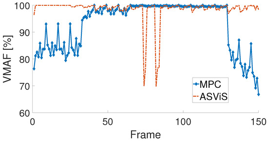 Subsequent evaluations explored video quality throughout the entire video playback. The Y-PSNR findings are presented in Figure 15, whereas VMAF results can be found in Figure 16. Both algorithms exhibited comparable video quality from frames 40 to 130. However, at the commencement and conclusion of the video playback, the quality of MPC was observed to be inferior to that of ASViS. This discrepancy is attributed to the conservative approach of MPC and its slower adaptation to network conditions compared to ASViS.