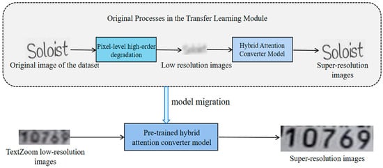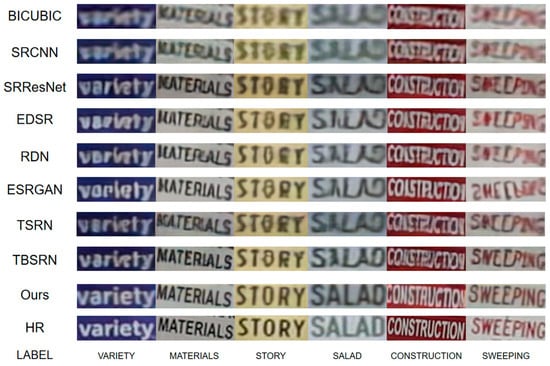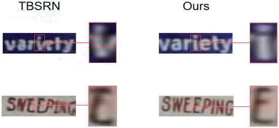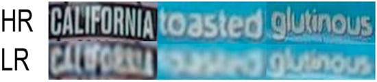 While modern optical character recognition models exhibit impressive accuracy rates on high-resolution (HR) text images [,], they still grapple with low accuracy when it comes to low-resolution (LR) images. To ameliorate this, many in the research community have turned their focus towards applying super-resolution techniques to these low-resolution scene text images.
