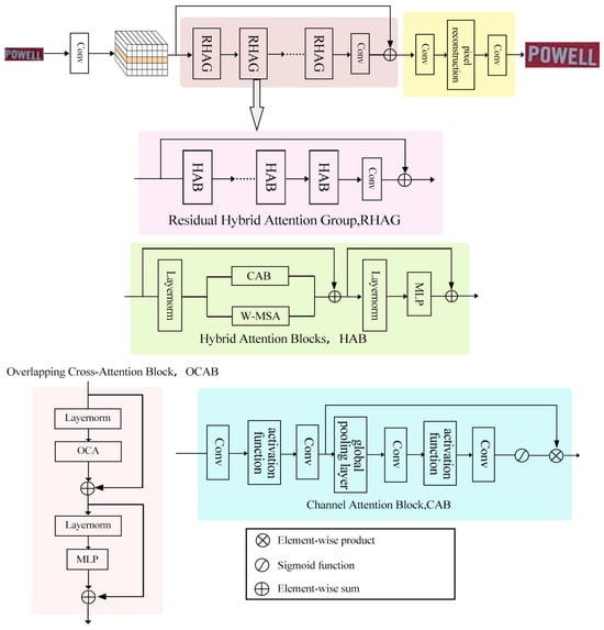 Equation (13) elaborates that Fi−1,0 represents the input features of the i-th RHAG, with CHAB symbolizing the Hybrid Attention Block. In Equation (14), Fi−1,j is the j-th output feature of the j-th Hybrid Attention Block within the i-th Residual Hybrid Attention Group.