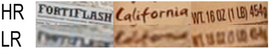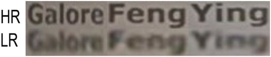 The TextZoom dataset stands out as the inaugural dataset focusing on real-world text super-resolution, encompassing a series of paired scene text data. Traditional super-resolution methods, which typically employ simple bicubic interpolation or blur kernel for generating low-resolution images, fall short when applied to scene text, given its arbitrary shapes, varying backgrounds, and distinct lighting conditions. To address this more challenging issue, the TextZoom dataset incorporates LR-HR image pairs captured with digital cameras, sourced from RealSR [] and SR-RAW []. It comprises 17,367 LR-HR image pairs for training. The test set is divided into three categories. The categorization is based on the insight that “the smaller the focal length, the blurrier the image is at the same height”. In consideration of the recognition accuracy of the low-resolution images, the test set comprises 1619 image pairs cropped from RealSR, classified as belonging to the ‘easy’ difficulty category. These images are characterized by focal lengths greater than 100 mm, and notably, the recognition rate of low-resolution images from RealSR, under the ASTER recognition model, surpasses that of SR-RAW. A ‘medium’ difficulty category includes 1411 pairs of low-resolution images with focal lengths exceeding 50 mm. Finally, 1343 pairs of low-resolution images featuring focal lengths less than 50 mm are categorized as ‘hard’ difficulty. During experiments, LR image resolutions were adjusted to 16 × 64 pixels, while HR images were adjusted to 32 × 128 pixels. Figure 4, Figure 5 and Figure 6, respectively, present samples from the TextZoom dataset spanning the simple, medium, and difficult subsets. As evident, while the simple difficulty LR images can be discerned with ease, those of high difficulty are profoundly blurred.