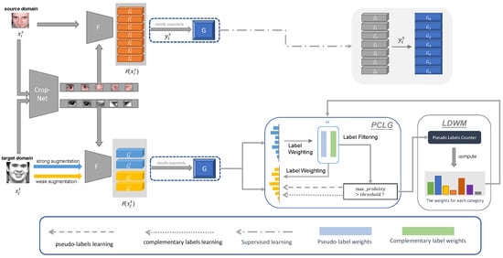 Pseudo-label learning involves incorporating unlabeled data into model training to enhance the performance of supervised processes by utilizing model-predicted transformed hard labels [32,33,34,35]. Occasionally, certain samples may exhibit uncertainty regarding their categorization across multiple classes. In response to this challenge, Rizve et al. [36] introduced uncertainty into the framework and selected pseudo-labels based on uncertainty, thereby incorporating unlabeled data to enhance model robustness and performance. Zheng et al. [35] employed a progressive soft pseudo-label refinement mechanism, starting from coarse labels and refining them progressively. This approach aims to generate more robust and refined soft pseudo-labels, allowing the model to learn more discriminative features tailored for challenging samples. The “Noisy Student” approach [37] has been utilized when generating pseudo-labels to prevent the model from overfitting to known data as well as to enhance its generalization. Recently, the confidence-based threshold strategy has been considered to select appropriate pseudo-label data for the target domain. In [38], FixMatch was introduced; this approach utilizes high-confidence predictions from the weak augmentation branch to generate pseudo-labels, then trains the model by aligning predictions from the strong augmentation branch with the pseudo-labels using the standard cross-entropy loss. Unlike the previous work, Xie et al. [39] guided model training using the consistency loss in order to ensure similar data representation from different perspectives. Another recent study [40] applied adversarial training to enhance the confidence of pseudo-labels and improve the adversarial training process using these pseudo-labels. These two processes complement each other, strengthening the transfer effectiveness from the source domain to the target domain. However, reliance on a large amount of unlabeled data in generating pseudo-labels can lead to models classifying unlabeled data with excessive confidence, introducing erroneous pseudo-labels and misleading information. Furthermore, previous models have not considered the difference in class distributions between the source and target domains, a key factor influencing the ultimate transfer performance. In this work, we propose a novel approach that combines pseudo-complementary label generation with a dynamic label weight matching strategy to mitigate the impact of class imbalance.