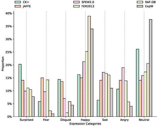 Bar plot illustrating the category distribution in the training set across six datasets: CK+, JAFFE, SFEW2.0, FER2013, RAF-DB, and ExpW.