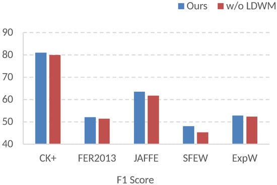 Our experimental evaluation compared our proposed model with state-of-the-art CD-FER methods. We chose ResNet50 and MobileNet-v2 as our backbone network, each having distinct hierarchical structures and feature extraction capabilities. This choice was taken for two main reasons: first, these networks can leverage pretrained weights from large-scale datasets, accelerating convergence and enhancing performance; second, we aimed to assess the robustness of our algorithm across different backbones. Taking data from Table 1(i) as an example for further data analysis, when using RAF-DB as the source domain and ResNet50 as the backbone network, our algorithm demonstrates significant performance improvements on the Ck+, JAFFE, SFEW2.0, FER2013, and ExpW datasets, with respective accuracy increases of 3.1%, 7.04%, 0%, 1.8%, and 2.23% compared to the state-of-the-art algorithms. These results indicate that our method is positioned competitively compared to existing approaches. However, when replacing the source domain with FER2013 while keeping ResNet50 as the backbone, the performance of almost all algorithms exhibited varying degrees of decline on all datasets. This underscores that the similarity between the source and target domains has an important effect on accuracy. It can be seen from Table 1 that when we maintained the same source domain and replaced ResNet50 with MobileNet-v2 as the backbone, the performance of most algorithms showed varying degrees of decline on all datasets. This could be attributed to MobileNet-v2’s adoption of deeply separable convolution in its architecture, resulting in relatively weaker feature extraction capabilities than ResNet50.