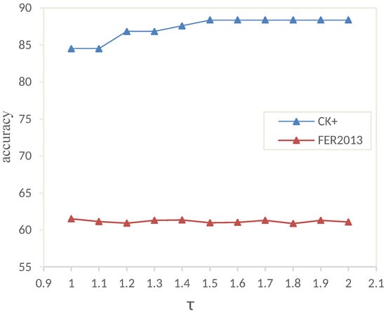 The hyperparameter (temperature) plays a crucial role in the feature learning process for the target domain. Initially, we set to 1.0 as the initial value, equivalent to not introducing any hyperparameter. Subsequently, we increased in increments of 0.1 while observing the impact on the experimental results for each dataset. Notably, we observed that these fluctuations in the hyperparameter significantly affected the CK+ and FER2013 datasets. Hence, we selected these two datasets for experimentation to determine the optimal range of the hyperparameter . The temperature parameter serves as a balancing factor between learning the characteristics of challenging samples and preserving the features that have already been learned. Specifically, CK+ exhibited a decline in performance when dropped below a certain threshold, while FER2013 performed better with values closer to 1.0. We conducted experiments with different values on the CK+ and FER2013 datasets to investigate this phenomenon, as illustrated in Figure 4. We found that when exceeded or equaled 1.5, the CK+ dataset achieved its best performance. In contrast, the performance of FER2013 fluctuated while remaining at a relatively high level with values close to 1.0.