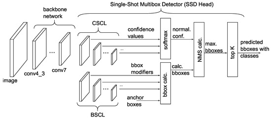 In the SSD Head, there are always paired convolutional layers. One layer determines the confidence values, marked as the Confidence SSD Convolutional Layer (CSCL), while the other calculates the bounding box modifiers, referred to as the Bounding Box SSD Convolutional Layer (BSCL). Additionally, there is a third layer that calculates the anchor boxes. These boxes are trainable parameters of the network, but they remain constant for every SSD network once trained.