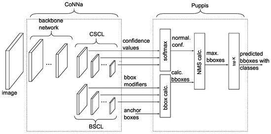 22] for this purpose. In contrast, the Puppis HW accelerator will accelerate the remaining calculating functions from the SSD Head: softmax, bounding box, non-maximum suppression, and top-K sorting. By working together, CoNNa and Puppis enable the hardware acceleration of the complete SSD network.