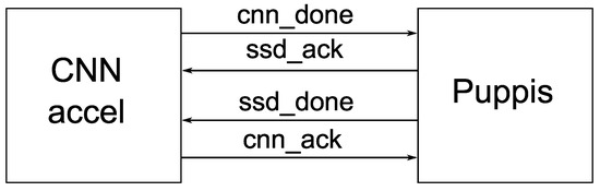 The second interface includes the ssd_done and cnn_ack signals. Here, Puppis asserts ssd_done when processing is complete, and cnn_ack is triggered when the CNN accelerator acknowledges it and switches to process the following input feature map.