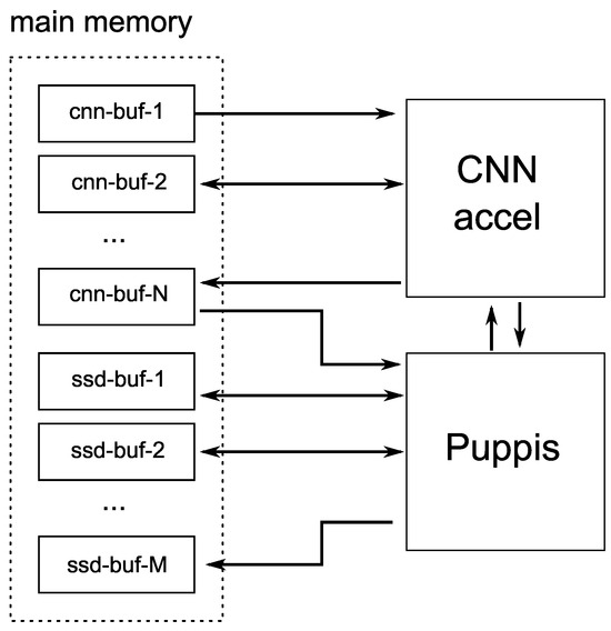 Please notice that the described setup enables the implementation of a coarse-grained pipelining technique during the processing of a complete SSD network by the proposed system. While the Puppis HW accelerator processes CNN-generated information for the input image i, the CNN HW accelerator can already start processing input image i+1. This setup can significantly increase the processing throughput of the complete system, although the processing latency will remain unchanged. In applications where achieving a high frame rate is of interest, this could prove highly beneficial.