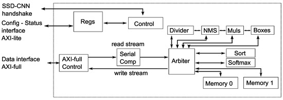 The computation’s last step is the top-K sorting procedure, which identifies the top-K bounding boxes from the results obtained through the non-maximum suppression block. The implemented sorting procedure is a simple bubble-sort algorithm. Since this step does not require much computation, a simple sequential architecture is used for this module.