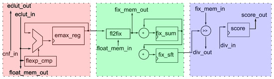 The module receives confidence values from the main memory in the first pipeline processing stage. The module determines the maximum value of the floating-point exponent by utilizing samples of a floating-point function stored in the ECLUT memory. This value is stored in the output register flexp_cmp and serves as the input for the second pipeline stage.