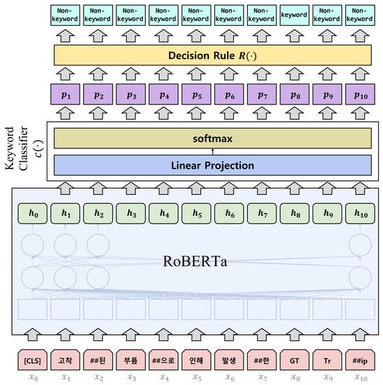 where E is the embedding size. Note that RoBERTa is encoder-centric since it is based on BERT. Thus, an additional keyword estimator is required to adopt RoBERTa in an end-to-end style [22,23]. This paper uses a linear projection with softmax as the keyword estimator where it takes as an input and calculates the probability of ’s being a keyword. That is,