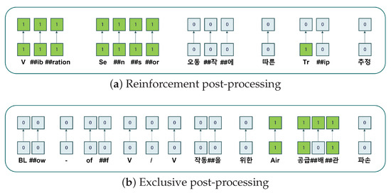 The examples of two types of post-processing. The example in (a) is “Trip estimation due to vibration sensor malfunction”, and the example in (b) is “Damage of air supply pipe for blow-off V/V operation”. If the label is 1, it is classified as a keyword, and, if the label is 0, it is classified as a non-keyword. Words are separated through wide spacing.