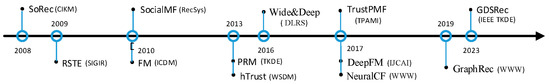 The recommendation algorithm was first proposed by Xerox’s Paraoto Research Center in 1992, which is an RS based on CF algorithms for spam filtering. In 2003, Amazon truly applied recommendation algorithms to the commercial field. Netflix proposed MF technology in 2006, effectively solving the above problems. MF has a strong generalization ability, but it requires a large amount of computation and is not suitable for dealing with large-scale sparse matrices. In 2007, a trust-aware CF recommendation algorithm was proposed, which is a memory-based CF recommendation algorithm that integrates the user’s trust propagation mechanism into the CF recommendation algorithm [23]. In 2009, a probability factor factorization model was proposed, which fuses user interests with the preferences of trusted friends. Osaka University proposed the FM model in 2010, which can capture second-order features well, and has some mathematical skills. The algorithm has a relatively low time complexity. After 2012, FM gradually became the mainstream algorithm in the recommendation field, until gradient boosting decision tree was applied in the recommendation field [24,25]. In 2019, a new GNN framework for social recommendation was proposed to jointly capture interactions and opinions in user–item graphs, which consistently models two graphs and heterogeneous strengths [26]. The key milestones and developments of social relationship-based RSs is shown in Figure 1. Figure 1 shows representative social relationship-based recommendation techniques from different periods and which publication or conference they were published in. These recommendation techniques are arranged in chronological order.