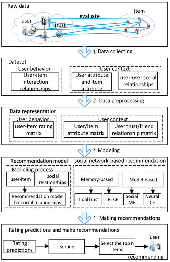In recent years, domestic and foreign researchers have conducted extensive research on RSs based on social networks and proposed many effective recommendation algorithms. Although these recommendation algorithms use different technologies, the recommendation framework models are all based on the structural characteristics of social networks, the popularity of items in social groups, and the impact of social relationship information between users on recommendation quality [6,8,23,40]. The basic framework of a social network RS is shown in Figure 2, which includes four steps [9,10,32,41]: