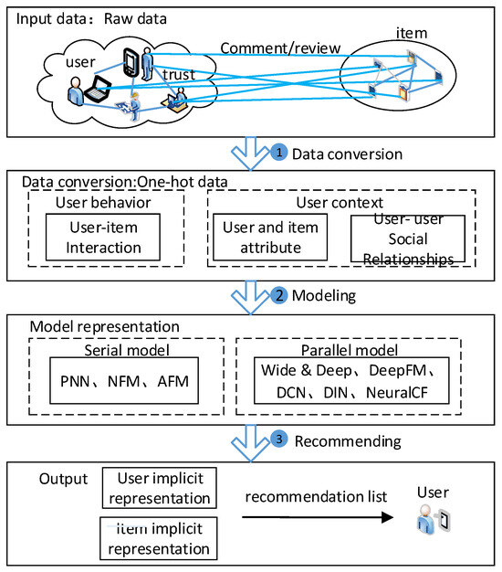 DL combines low-level features to form more dense high-level semantic abstractions, automatically discovering distributed feature representations of data, solving the problem of manually designing features in traditional machine learning. The DL-based RS usually takes various types of users and items as input, uses DL models to learn implicit representations of users and items, and generates item recommendations for users. The DL-Based recommendation framework integrating social relationships is shown in Figure 3.