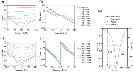 The amplitude and phase responses of the proposed unit element. (a–d) Simulated amplitude and phase responses of the unit element with different RDs from 10 to 12 GHz; (e) simulated amplitude and phase responses of the unit element with different RDs at 11 GHz.