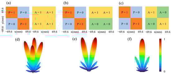The coupling between different unit elements diminishes the periodic boundary conditions, which leads to additional damage to the EM response. To mitigate this phenomenon, we introduce the concept of the superunit for designing the phase and amplitude codes. RAPM is composed of 2 × 2 superunits, which have a size of 69.6 × 69.6 mm2. Therefore, in Equation (4), Γx = Γy = 69.6 mm, equivalent to 2.55 times the ideal operating wavelength. Figure 4 illustrates the results of the metasurface far-field radiation patterns computed in MATLAB R2021a software with different phase amplitude codes. In Figure 4a–c, three metasurfaces whose phase-coding sequences of the superunit are 10/01 identically, but their amplitude-coding sequences are different. The metasurface with the amplitude-coding sequences of 11/11, 11/00, and 10/01 are named A1, A2, and A3, respectively. By employing a feeding system at the edges of RAPM, we can modulate the amplitude and phase responses of each superunit.