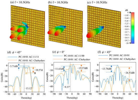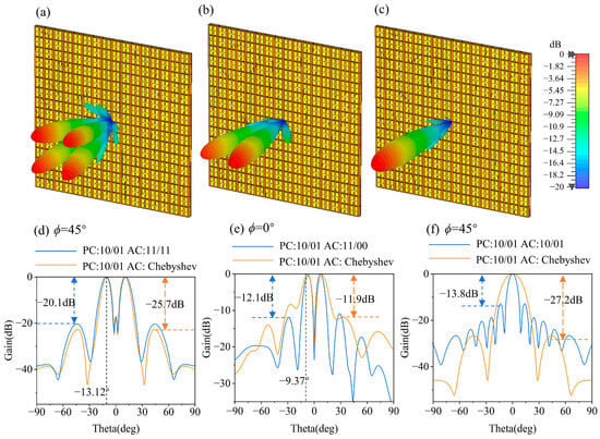 (a–c) Simulated 3-D far-field radiation pattern of A1, A2, and A3 in CST 2022 at 11 GHz; (d–f) simulated 2-D far-field radiation patterns of RAPM in CST 2022 at 11 GHz, in which PC is the abbreviation of the phase-coding sequence and AC is the abbreviation of the amplitude-coding sequence.