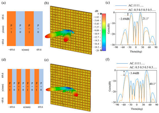 Figure 8b,e show the 3-D far-field radiation pattern of the reflected beams with different deflection angles. On the basis of the above phase-coding sequences, the amplitude sequence of the metasurface can be further encoded to realize the redistribution of EM waves’ energy. When the amplitude is synchronized, the codes vary within the range of 0.02–0.98 in order to regulate the energy intensity of the reflected beams. The energy intensity of the reflected beam can be adjusted by consistently varying the amplitude encoding in the range of 0.02 to 0.98. Additionally, optimizing the amplitude codes with the Chebyshev distribution allows for the suppression of the sidelobes of beams. As shown in Figure 8c,f, when the phase code of the unit element is unchanged and the amplitude code is collectively adjusted to 0.5, the energy intensity of the reflected beams is reduced by about 3 dB. In short, with different amplitude-phase-coding sequences, our proposed metasurface can realize the formation of diverse reflected EM beams and flexibly manipulate EM waves in 2-D space.