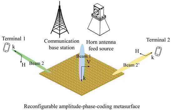 In recent years, metasurfaces, which can be regarded as a two-dimensional (2-D) version of metamaterials, have attracted significant attention from the scientific and engineering communities. Generally, metasurfaces consist of layers containing subwavelength elements that are arranged periodically or quasi-periodically in 2-D spaces [,,,]. Due to the extraordinary abilities of metasurfaces in manipulating electromagnetic (EM) waves, a frontier field that aims to arbitrarily modulate the phase [,], polarization [,], and amplitude [,] of EM waves has become one of the most popular topics of exploration. In the previously reported works, most metasurfaces are based on the generalized Snell’s law [], which controls the phases of EM waves by designing element structures and arranging the layout of elements to achieve anomalous reflection and refraction. However, the EM properties of metasurfaces are affected by their inherent lattice structures, and the EM performance cannot be changed after fabrication. Therefore, there is a broad application requirement and development prospect for metasurfaces with reconfigurable EM responses.