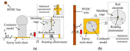 The contact and non-contact electrometers are presented in Figure 2. The test sample and the contact electrometers were connected by a measuring lead, and the sample with the measured potential was grounded through a high internal resistance. The potential was obtained by measuring the current flowing through the internal resistor. The internal resistance of the contact electrometer was ΔR = 20.3 GΩ, and this was measured by using a digital insulation resistance tester (PeakMeter MS5205). The rotation of the vane on the non-contact electrometer caused the total electric flux received on the sensing element to change periodically, and the corresponding induced charge also changed periodically. The corresponding potential was obtained by using the current formed by the periodically changing charge. Four non-contact electrometers were also placed on the ground to measure the electric fields [22,23]. The structure of the experimental platform established in the laboratory is given in Figure 3. The left part shows the conductor model and HVDC line. The height of the HVDC line was 80 cm, and the radius was 1.12 mm. A conductor model made of stainless steel was situated on a piece of an epoxy resin sheet. The distance between the center of the conductor model and the HVDC line in the x direction was 50 cm. The size of the epoxy resin sheet was 20 cm × 20 cm × 0.4 cm. The voltage on the HVDC line was supplied by a high-voltage power source (Matsusada AU-120).