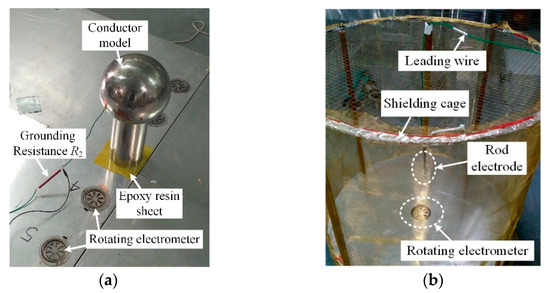 The right part of Figure 3 shows the modified measurement method based on a non-contact electrometer. The rotating electrometer was located at the bottom of the shielding cage. The radius of the shielding cage was r1 = 40 cm. The conductor model and the rod electrode were connected by a leading wire. The leading wire near the shielding cage was fastened with an epoxy resin rod. The length of the epoxy resin rod inside the shielding cage was l = 40 cm. The leading wire was covered with an insulating coat. The area where the leading wire crossed the grounded shielding cage was also filled with epoxy resin, as shown in the zoomed-in schematic in the top-right corner of Figure 3. The radius of the hole of the leading wire was r2 = 1 cm. The distance between the center of the conductor model and the shielding cage was D = 160 cm. A photo of the experimental site is presented in Figure 4.