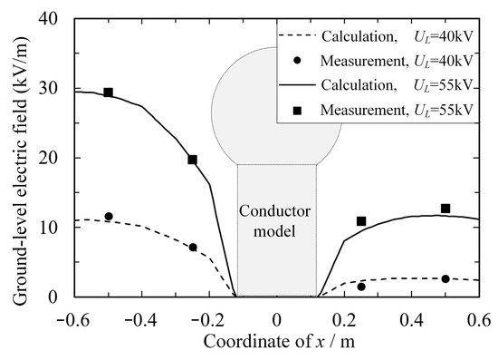 The electric field without space charges and the ion flow field were calculated using the method described in Section 2.1. To ensure the accuracy of the electric field calculation, the calculated ground-level electric fields near the conductor were compared with the measurements. The corona onset voltage of the HVDC line Eon was 44.6 kV; therefore, the voltages on the HVDC line (UL = 40 kV and 55 kV) were able to generate a space-charge-free electric field and ion flow field, respectively. In the calculation, the grounding resistance of the conductor model was R2 = 10 GΩ. The ground-level electric field around the conductor model is shown in Figure 5. The maximum relative error between the measurements and calculations was 6.8%.
