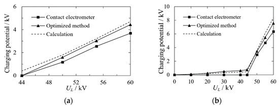 The measured charging potentials on the conductor model are presented in Figure 6. In the experiment shown in Figure 6a, a 10 GΩ high-voltage glass glaze resistance (RI80-10GJ) was used to connect the conductor model and the ground. According to (13), the time constant τ in this system was about 1 s. The sampling period of the rotating electrometer in the experiment was 5 s. The boost speed of the HVDC line’s potential was about 2 kV/s. In a space-charge-free electric field, the measured charging potential was recorded as 0 kV. The corresponding calculated potentials presented in Figure 6a are specified as uC0. After the corona discharge occurred, the charging potential was raised with the increase in UL. Because of the influence of ΔR, the measured values obtained with the contact method were lower than those obtained with the modified method in the ion flow field. Meanwhile, the measurements obtained with the modified method showed good agreement with the calculations.