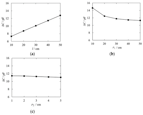 Influence of the shielding cage on ΔC. (a) Length of the leading wire l. (b) The radius of the shielding cage r1. (c) The radius of the whole of the leading wire r2.