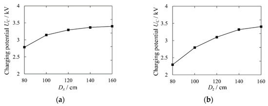 The existence of a shielding cage reduces the measured charging potential. The influence can be weakened with an increase in the distance between the center of the conductor model and the shielding cage D. In the following, the location of the shielding cage is discussed. As shown in Figure 3, Dx is a path that is perpendicular to the HVDC line and Dz is a path that is parallel to the HVDC line.