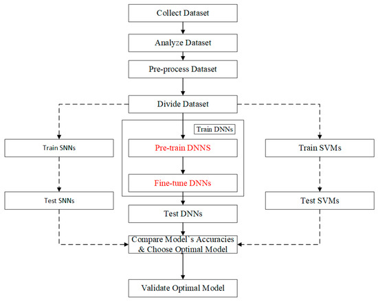 Figure 6b illustrates the training and validation accuracy of the SVM, SNN, and DNN models. When the number of hidden layers in DNN ranges from three to six, both training and validation accuracies of DNN are lower than those of SNN and SVM. However, the pre-trained and fine-tuned DNN model achieves higher training and validation accuracy compared with SNN, SVM, and non-pretrained DNN models. The 8-(7-5-4-3-3)-1 structure with five hidden layers, pre-trained and fine-tuned using SAE, exhibits the best accuracy. It achieved a training accuracy of 0.99 and a validation accuracy of 0.913, which was 0.051 higher than SVM’s validation accuracy, 0.063 higher than SNN’s validation accuracy, and 0.07 higher than the non-pretrained DNN’s validation accuracy.