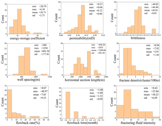 In the field of petroleum geology, the quantitative assessment of reservoirs is primarily analyzed through geological, developmental, and engineering factors. The evaluation and analysis of low-permeability tight oil reservoirs are conducted through fifteen geological factors, such as permeability, porosity, pore throat radius, movable fluid saturation, clay mineral content, and others [25]. The analysis and assessment of tight oil horizontal wells are made according to ten development and engineering factors, including reservoir properties, horizontal segment length, heterogeneity, fracture density, fracture connectivity, etc. [26]. Therefore, we collected data from 50 wells in the z183 oil reservoir for our experiment, and identified 13 factors that may influence the initial production capacity of tight oil horizontal wells. These 13 factors can be categorized into three major groups. Firstly, the geological factors include the energy-storage coefficient, permeability, and brittleness. Secondly, the development factors include well spacing, horizontal section length, fracture density, flowback rate, flowback time, and pressure difference. Thirdly, the engineering factors include fracturing fluid intensity, sanding intensity, sand ratio, and total capacity.