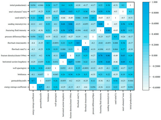 As is well known, the Pearson algorithm uses correlation coefficients to assess the degree of association between variables and the target variable, as well as the strength and direction of the relationship between two variables, in order to select the most relevant features. In this study, to avoid negative impacts of certain factors on production capacity prediction, which may lead to reduced model accuracy, the correlation between each factor and initial production capacity is visualized by creating a heatmap. This allows for the selection of influencing factors that have a positive correlation with initial production capacity, aiding in the establishment of an optimal solution for the model (Figure 4).