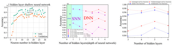 Figure 6c demonstrates the impact of using L2 regularization expression and the improved expression as the model loss function on model accuracy. It is evident that when using the L2 regularization expression as the model loss function, overfitting occurs due to the limitations of the small dataset, and the accuracy on the validation set is consistently below 90%. In contrast, when using the improved loss function, overfitting is mitigated, and the validation accuracy significantly surpasses that of the DNN models using the L2 regularization expression. This indicates that the improved L2 expression is suitable for models with small datasets.