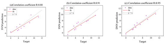 Figure 7 displays linear regression results for each model on the prediction dataset. The DNN model pre-trained and fine-tuned with SAE (correlation coefficient R = 0.95) outperformed the SNN model (R = 0.91) by 4% and the SVM model (R = 0.88) by 8%. This further confirms that the SAE pre-trained and fine-tuned DNN model has superior generalization compared with SNN and SVM.
