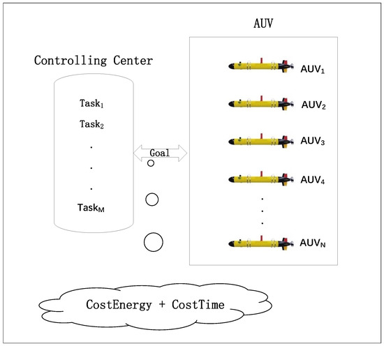 With the continuous development of Multi-AUV technology, the complex marine environment and variable mission requirements have posed new challenges to Multi-AUV systems [8,9]. When the Multi-AUV system carries out cooperative operation task planning, the problem of Multi-AUV task allocation should be solved firstly [10]. For different operating environments and mission requirements, a reasonable task-allocation algorithm can accurately analyze and process the complicated tasks, so that each AUV in the Multi-AUV system can fully utilize its own resources to efficiently and safely complete the underwater cooperative operation tasks, optimizing system performance [11,12,13].