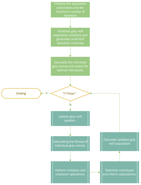 The DE-GWO algorithm utilized in this study was derived from the GWO algorithm, which draws parallels between the solution process of the Multi-AUV multi-task issue and the gray wolf searching for prey in the search space. The gray wolf stands for a set of feasible solutions for the Multi-AUV task assignment, with the optimal solution being the location of the prey. The flowchart of the DE-GWO algorithm is shown in Figure 2: