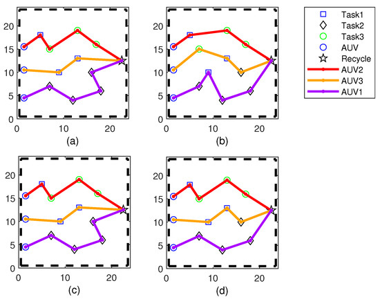 Comparison of task-assignment algorithms for a Multi-AUV system. (a) Results of task allocation using the GWO algorithm; (b) results of task allocation using the DE algorithm; (c) results of task allocation using the PSO algorithm; (d) results of task allocation using the DE-GWO algorithm.