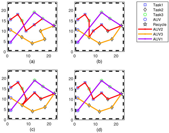 Comparison of task assignment algorithms for Multi-AUV system. (a) Results of task allocation using the GWO algorithm; (b) results of task allocation using the DE algorithm; (c) results of task allocation using the PSO algorithm; (d) results of task allocation using the DE-GWO algorithm.