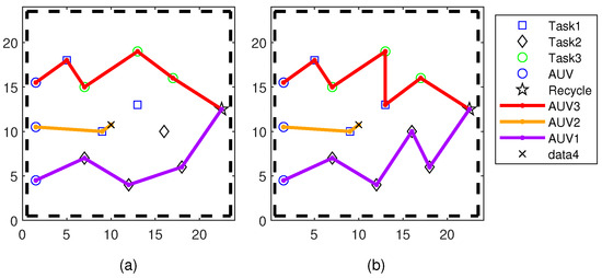 Comparison before and after task reassignment. (a) AUV 2 malfunctioned; (b) task reassignment results.