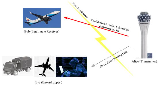 As a supplement to upper-layer security, physical layer security (PLS) (known elsewhere as information-theoretic security) can provide secure wireless transmission by exploiting the difference between legitimate channels and wiretap channels from the perspective of the information theory [9]. Without any extra delay due to encryption, PLS can achieve a lightweight security guarantee for aviation communications systems. As such, PLS-aided L-DACS has begun to attract attention due to the possibility of guaranteeing the privacy of civil aviation management and control information. However, the related research remains in the preliminary stages. In 2017, the wireless datalink security of L-DACS was first discussed in [10], where the authors pointed out that existing upper-layer security methods could not be directly applied to L-DACS because of its narrow frequency band and susceptibility to pulse interference. To prevent illegal third parties from eavesdropping and attacking, it is possible to increase the physical layer transmitting power of L-DACS; however, this high power may cause interference with DME systems. The authors of [10] proposed detecting the presence of illegal users through real-time monitoring of system states such as the packet loss rate, signal-to-noise ratio (SNR), and other indicators, then guaranteeing information security by switching the current transmission to duplicate links. However, this approach consumes extra bandwidth resources. To improve the throughput while simultaneously enhancing the security in an L-DACS-based aeronautical ad hoc network, a novel PLS method based on channel quality indicator (CQI)-mapped spatially modulated sparse code multiple access (SM-SCMA) was proposed in [11]. In this method, a physical-layer secret key is generated by varying the SM-SCMA mapping patterns based on the instantaneous CQI in the desired link. Because this secret key is not exchanged between the source aeroplane and its destination, the ergodic secrecy rates can be significantly improved. However, the impact of high-power DME pulse interference on L-DACS was not taken into account.
