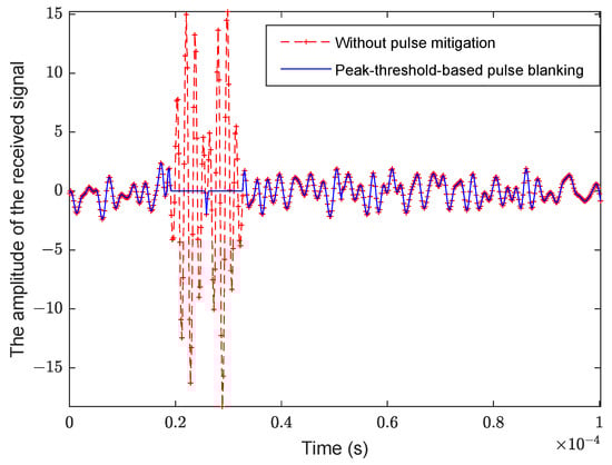 First, to show the effects of pulse interference mitigation on L-DACS, we simulate the time domain signals of the system with the peak threshold-based pulse blanking method and peak threshold-based pulse clipping method, as shown in Figure 2 and Figure 3, respectively. The original time domain signals were obtained using the official L-DACS simulation platform [28]. As shown in Figure 2 and Figure 3, the original received L-DACS signal suffers pulse interference from DME, which appears as pulse pairs. With the peak threshold set as , both the peak threshold-based pulse blanking method and the peak threshold-based pulse clipping method have significant effects on interference mitigation.