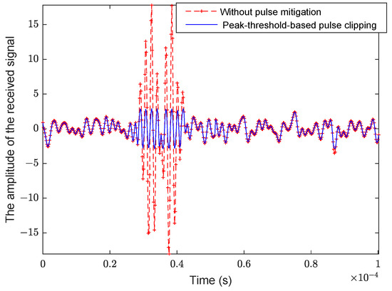 Equation (15) indicates that at the position of the impulsive noise, i.e., , the receiver performs ideal pulse blanking, which results in the whole received signal being blanked to zero. Therefore, in this case the equivalent noise satisfies . By contrast, for positions without impulsive noise, i.e., , only AWGN exists in the channel; hence, the equivalent noise satisfies .