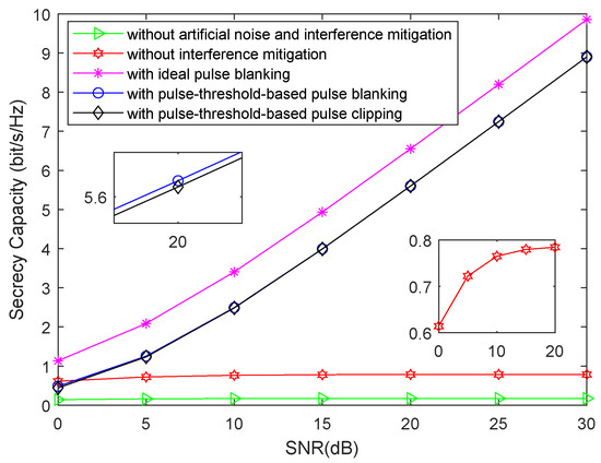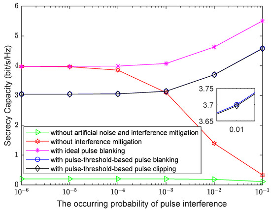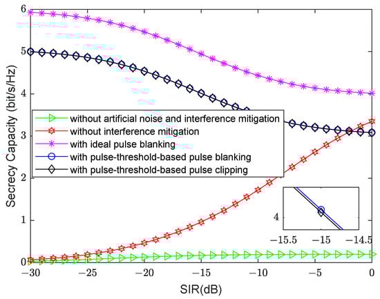 Further, when interference mitigation methods are adopted by the legitimate user, the secrecy capacity decreases as the pulse interference level decreases. The reason behind this is that the effect of adopting pulse interference mitigation methods is more obvious when the legitimate receiver suffers serious pulse interference, which corresponds to a smaller SIR and a larger probability of pulse interference. Because the capacity of the legitimate user is improved by interference mitigation while the capacity of the eavesdropper remains the same, an obvious pulse mitigation effect results in a large improvement in the secrecy capacity. In Figure 6 and Figure 7, we find an interesting result in that when the pulse interference level is low enough, the secrecy capacity obtained by peak threshold-based pulse mitigation is smaller than the secrecy capacity without any pulse interference mitigation method. This result is reasonable because in this case the pulse interference is weak and the amplitude of the pulse interference is even smaller than the amplitude of the received signal. When adopting peak threshold-based pulse mitigation, the useful signal of Bob may be blanked or clipped, which has a negative effect on the secrecy capacity. However, this negative effect does not occur in the case where ideal pulse blanking is used, as the receiver with ideal pulse blanking can mitigate the pulse interference precisely without threshold judgment.