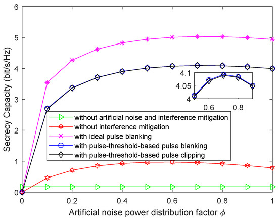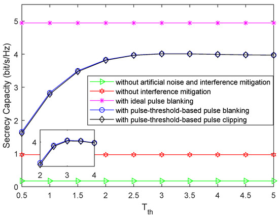 Figure 5 shows the effect of the threshold on the secrecy capacity. For the case with no pulse interference mitigation and ideal pulse blanking, a change in the threshold has no effect on the secrecy capacity, which is in line with the theoretical analysis in Section 3. In the case where the legitimate receiver adopts peak threshold-based pulse blanking and peak threshold-based pulse clipping, the secrecy capacity is a convex function about the threshold. In detail, as the threshold increases, the secrecy capacity first increases and then decreases, with the secrecy capacity reaching the maximum when the threshold is optimal. In this case, the optimal threshold is 3, which we used in the simulations shown in the subsequent Figure 6, Figure 7 and Figure 8. in this paper.