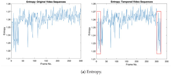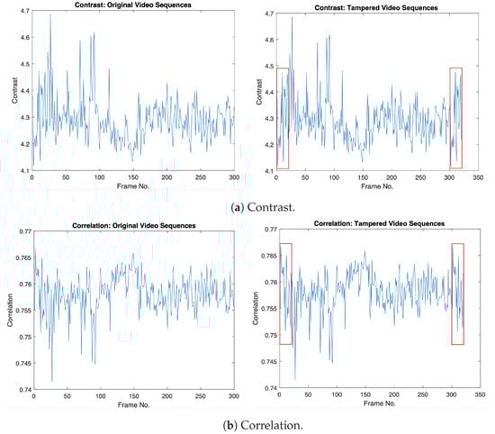 Generally, surveillance videos consist of static scenes (similar frames), which can be used as a useful tool for removing or duplicating events within the video sequence to produce new tampered videos with duplicated frames without leaving any visual traces of forgery. However, video frames in static scenes are not exactly the same based on their intensity values due to the existence of noise disturbance during the video acquisition step. The GLCM textural features’ operators for video frames can be used for detecting duplicated frames efficiently without dividing video frames into overlapping sub-sequences as in the literature. Figure 2 shows the GLCM textural features (Contrast, Correlation, Energy, and Homogeneity) of original and tampered video sequences, where the original frames (from 1:20) and tampered frames (from 301:320) have the same GLCM values in the tampered video sequence, which indicates the existence of frame duplication forgery, as indicated in the red box.