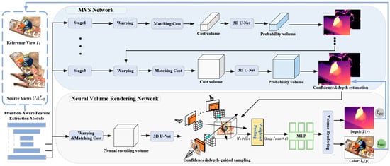 Illustration of the proposed approach. Our network consists of the MVS network and the neural volume rendering network.